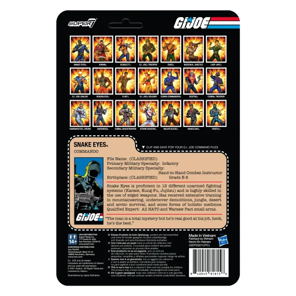 A Master Of Martial Arts And Infiltration Tactics, Snake Eyes Can Do Whatever Is Necessary To Take Down The Forces Of Cobra! This 3.75” Scale Articulated G.I. Joe Reaction Figure Of Snake Eyes Is Inspired By The Animated Series And Features His Navy Blue Uniform With Vertical Goggle Slat And Ankle Utility Band, And Comes With Two Weapon Accessories. Snake Eyes Is Used To Slipping Behind Enemy Lines Unnoticed, But Once You Add His Reaction Figure To Your Collection He Might Be The Figure You Notice The Most!