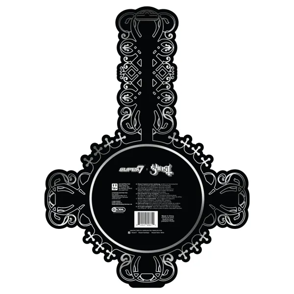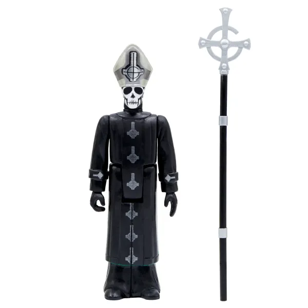 The Second Incarnation Of Papa Emeritus Returns In His Outdoor Live Performance Guise With Sunglasses. This Limited Edition Papa Ii 3.75″ Reaction Figure Comes With His Grucifix Staff Accessory Packaged On A Black Die Cut Silver Foil Stamped Grucifix Cardback Befitting His Stature In The Clergy During The Infesstissumam Era Of Ghost.