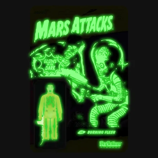 It’S Never Been Easier To See That The Martians Do Not Come In Peace! Based On The Vintage Topps Trading Card Burning Flesh #19, This Glow-In-The-Dark 3.75” Articulated Mars Attacks Reaction Figure Of A Martian Invader Includes A Melted Weapon Accessory And Is Packaged On A Cardback That Also Glows In The Dark! The Invasion Doesn’T Stop Just Because The Lights Go Out, So Add The Glow-In-The-Dark Mars Attacks Reaction Figures To Your Collection!