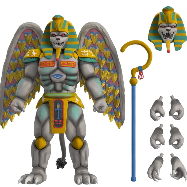 The Egyptian-Inspired Monster King Sphinx Is One Of The Most Dangerous Foes Ever To Cross Paths With The Mighty Morphin Power Rangers! ThiS 8” FUlly Articulated Mighty Morphin Power Rangers Ultimates! King Sphinx Figure Features Premium Paint Deco And Highly Detailed Sculpting, And Comes With Interchangeable Heads And Hands, And His Sphinx Scepter Accessory. King Sphinx’ Opponents Are Blown Away (Literally) By The Mighty Wind Blast From His Wings, And Your Friends & Family Will Be Blown Away (Figuratively) When They See You’Ve Added The King Sphinx Ultimates! Figure To Your Collection!