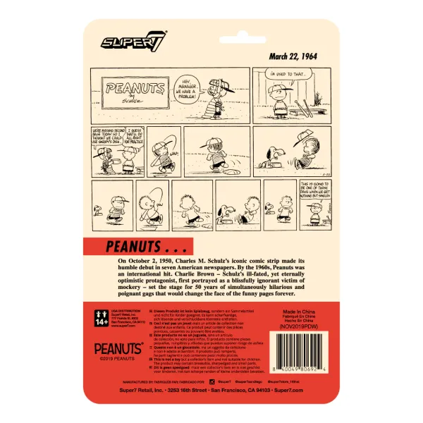 The Super7 X Peanuts Collaboration Continues With Wave 2 Of 3.75″ Reaction Figures: Snoopy Flying Ace! Charlie Brown Manager! Franklin! Peppermint Patty! Marcie! Spike! All Are Inspired By The More Stylized Characters Of The 1950’S And 60’S!Charlie Brown Manager Made His Baseball Debut In The March 22, 1964 Peanuts Comic Strip. The Original Comic Is On The Back Of The Card.