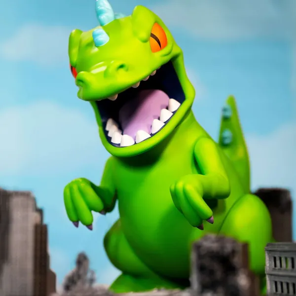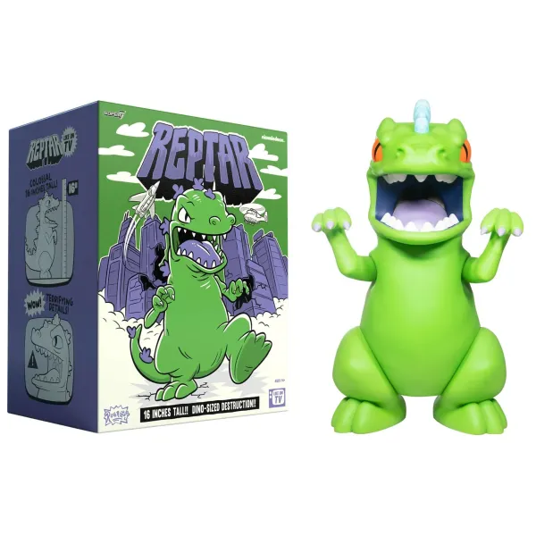Just Ask Tommy Pickles Or Any Of The Rugrats Kids, Reptar Is The Bestest Hero Ever! This Supersize Reptar Designer Vinyl Figure Measures 16” Tall And 13” Long From Snoot To Tail, Andfeatures A Poseable Head, Arms, Legs, And Tail. With Bright Green Skin, Big Teeth, Purple Tongue, Orange Eyes, And Blue Spikes All Along Its Back And Tail, Supersize Reptar Includes All The Detailsthat Make Him Larger Than Life In The Eyes Of The Rugrats!