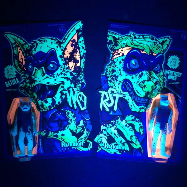 The Worst Returns With The Glow-In-The-Dark Neon Blood Splattered Batula And Werewolf Biker Friday The 13Th Set! This Limited Edition Bar Fight Features Our Badboys On Mind Bending Die Cut Cards That Fit Together Like A Pair Of Fists Meeting Mid-Brawl!