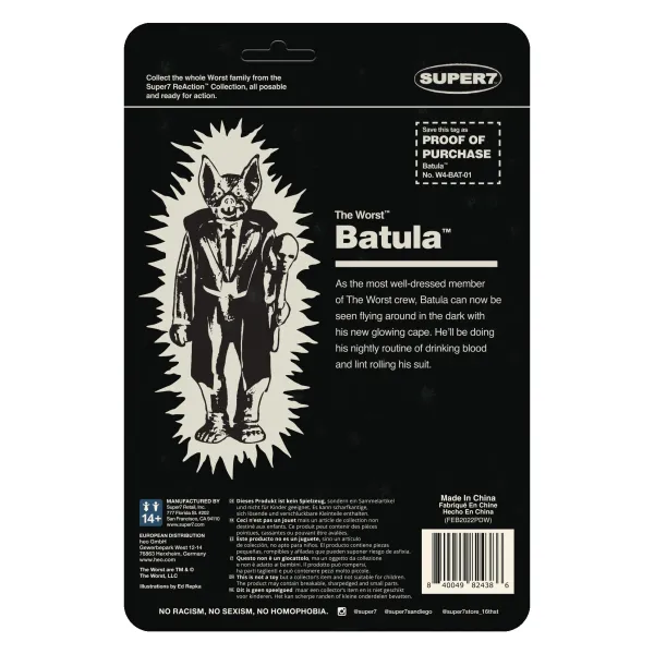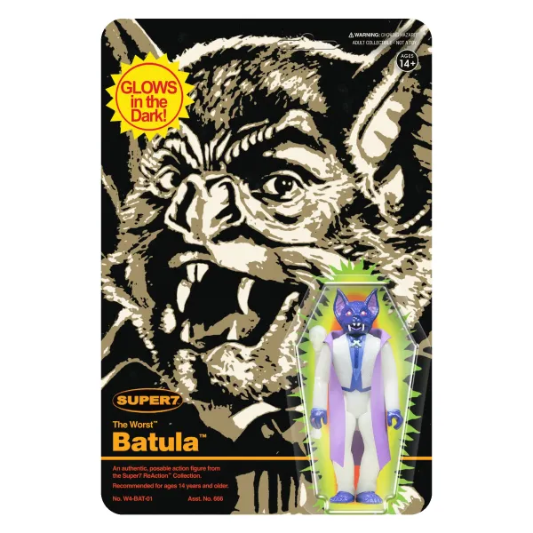 One Of The Original Members Of The Worst, Batula – The Bat Prince Of Darkness, Returns! This Special 3.75” Monster Glow Batula Reaction Figure Is Glow-In-The-Dark With Packaging That Pays Tribute To The Iconic Toy Packaging From The 80S. The Worst Are Super7’S Own Gang Of The Most Villainous Vile Vermin! There Are Good Guys. There Are Bad Guys. And Then There Are…“The Worst”!