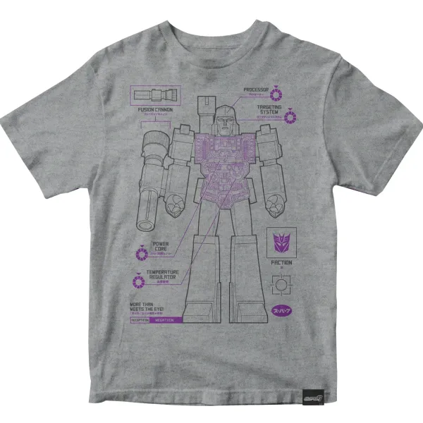The Super7 Exclusive Megatron Cyborg Diagram T-Shirt! Available In Unisex Sizes Sm – 3X With Super7 Hem Tag. Tee Color: Grey. Short Sleeve 100% Cotton Machine Wash / Tumble Dry.