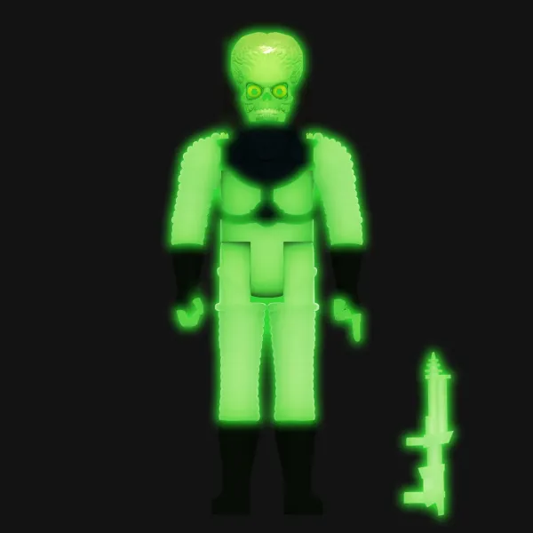 With Technology Nearly Beyond Comprehension, The Martians In The 1962 Topps Mars Attacks Trading Card Series Descended On Humanity With Brutal Results. Paying Homage To The Invasion Begins #1, This Glow-In-The-Dark 3.75” Articulated Figure Of A Martian Invader Comes Complete With A Deadly Ray Gun And Is Packaged On A Cardback That Also Glows In The Dark! The Invasion Doesn’T Stop Just Because The Lights Go Out, So Add The Glow-In-The-Dark Mars Attacks Reaction Figures To Your Collection!