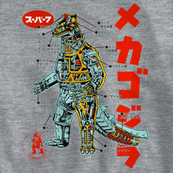 With An Anatomical Cutaway This Detailed, You Could Practically Build Your Own Mechagodzilla! This 100% Cotton Toho Mechagodzilla Anatomical Ringer Tee Features An Anatomical Cutaway Diagram Of Mechagodzilla With Japanese Language Notations, Inspired By Vintage Movie Posters. On A Heather Gray Shirt With Navy Blue Ringer Detail On The Collar And Sleeves, This Machine Washable T-Shirt Is Available In Sizes S-3X. With The New Toho Mechagodzilla Anatomical T-Shirt You’Ll Be A Ringer To Win Best Dressed At Your Favorite Kaiju Convention!
